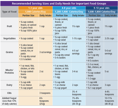 The chart below is based on information from the Academy of Nutrition and Dietetics and the American Association of Pediatrics. It describes recommended serving sizes and daily needs for important food groups.